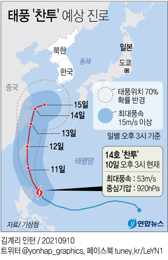 2021년 9월 13일월 0420 3일 전망 제주도 중심 매우 많은 비와 강풍 풍랑 주의 09월 13일부터 09월 15일까지의. 따라서 꼰선은 동북아시아 방면으로는 북상하지 못하고 남중국해로 진출할 것으로 예상된다. 14호 태풍 찬투의 자세한 예상 경로는 이렇습니다.