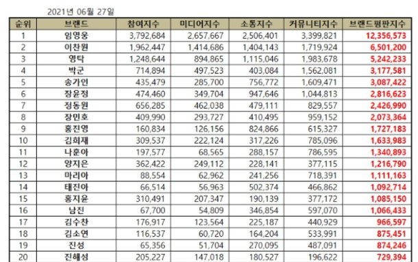 임영웅 트로트가수 브랜드 평판 1위 박군 상승세 영탁 40 하락 헤럴드경제