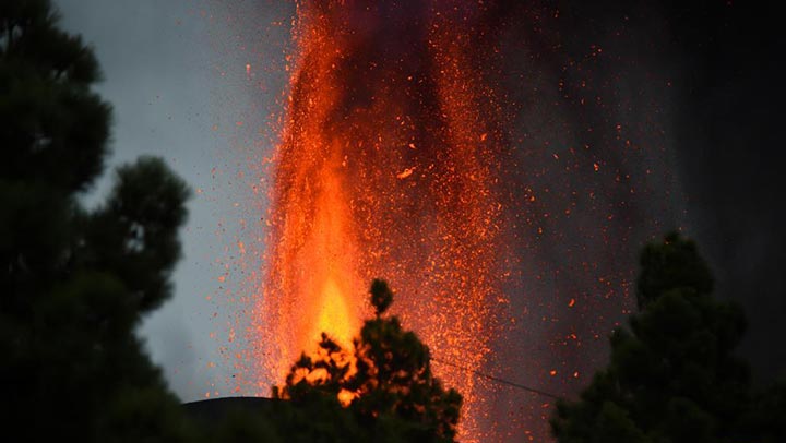 9月19日下午4点老昆布雷火山喷发了 高达1075摄氏度的岩浆从火山口喷射而出金红色的熔岩迅速覆盖整座火山以每小时700米的速度向山下的居民区流去 岩浆所到之处变成彻底的焦黑树木街道房屋在极度高温中消失殆尽.
