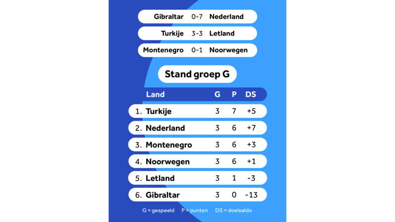 4-1 Montenegro Letland. Noorwegen is de nieuwe nummer twee in de groep Turkije voorafgaand aan het duel met Nederland nog koploper staat op plek drie. Door de 6-1 overwinning van het Nederlands elftal is dit de nieuwe stand.