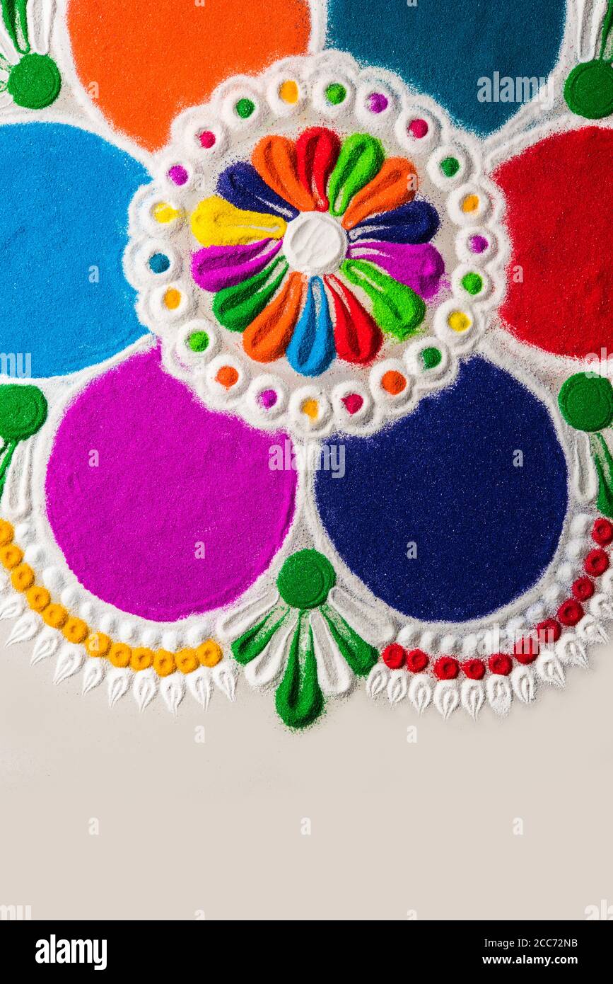 Rangoli Design Ist Eine Kunstform Die Wahrend Der Verwendung Von Pulverfarben Wahrend Diwali Onam Pongal Hindu Festivals In Indien Stockfotografie Alamy